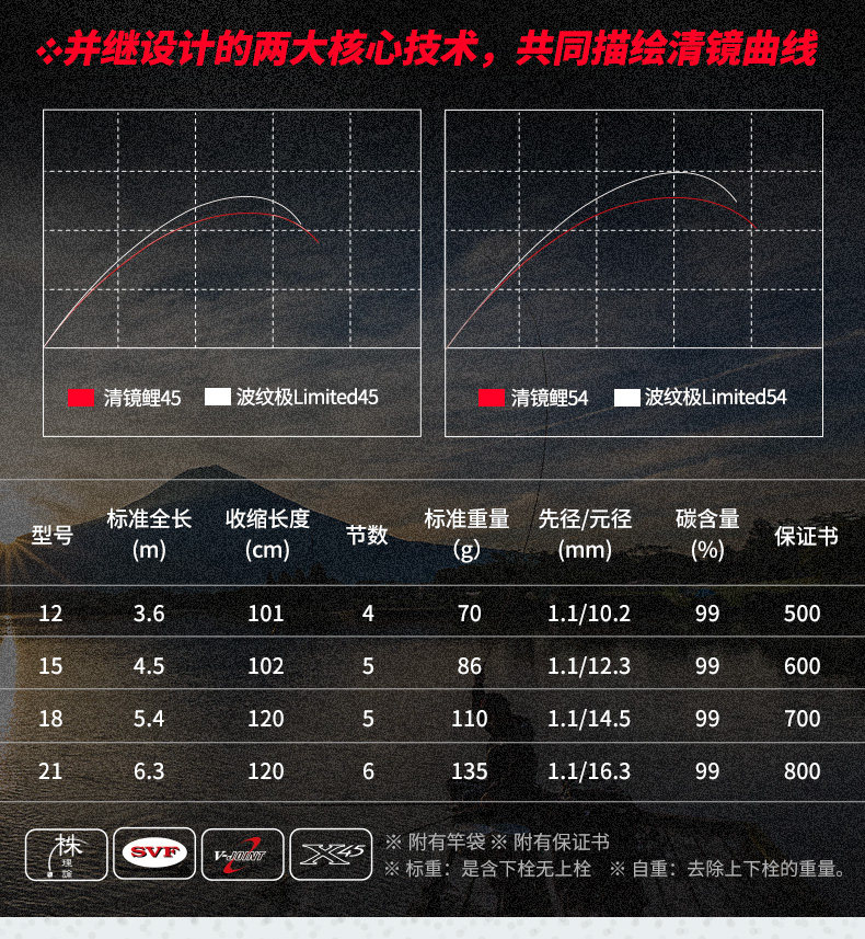 V-JOINT:具线条美感弧度能达到理想的状态及发挥更高威力。在竿节的部位使用DAIWA自身的BIAS构造。实现结合部的理想弧度,同时提高力量/传导/感度性能。 V-JOINTα:使用含nano+的高强度材质及DAIWA自身高精准度钓竿设计制造技术, 使V-JOINT更加强韧、轻盈、美观。
