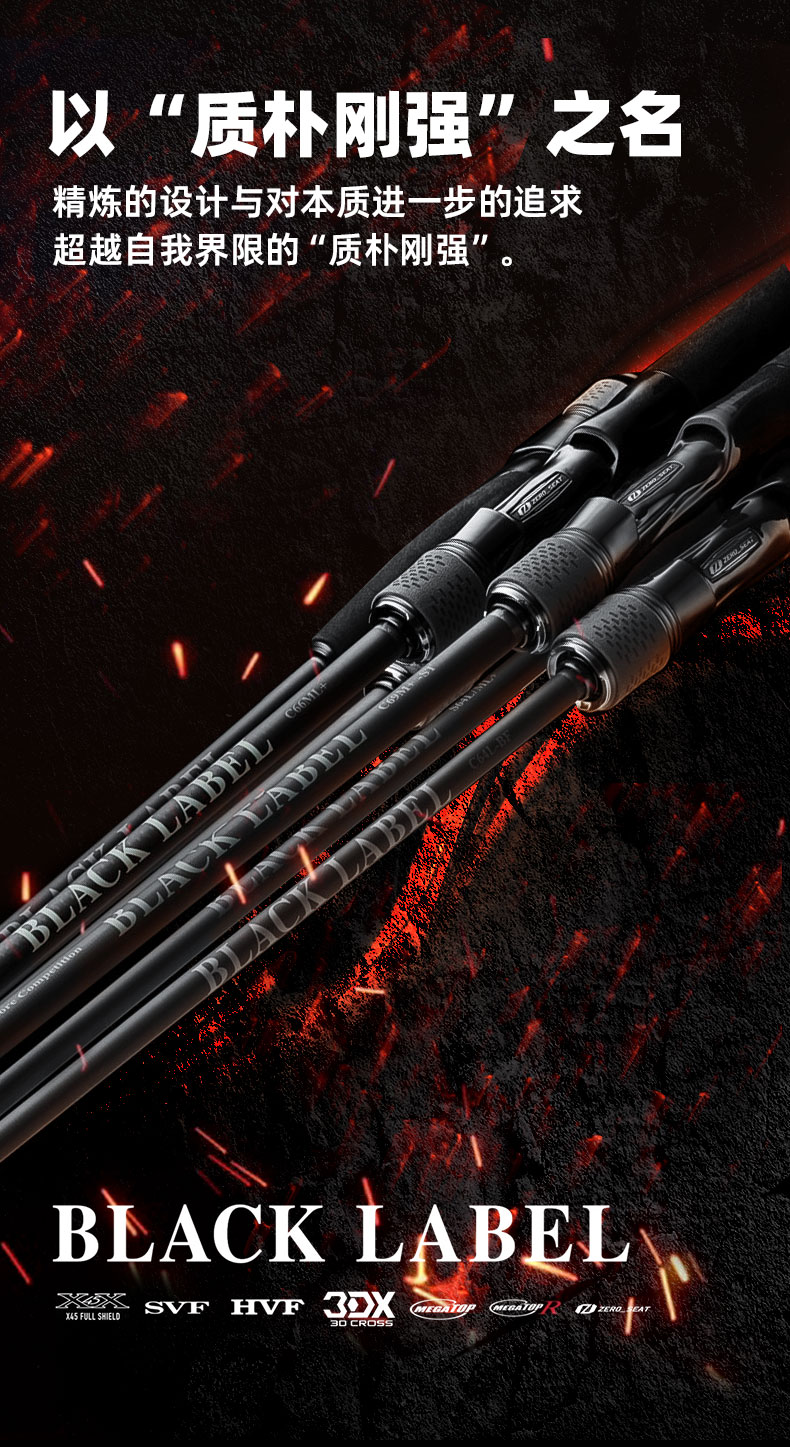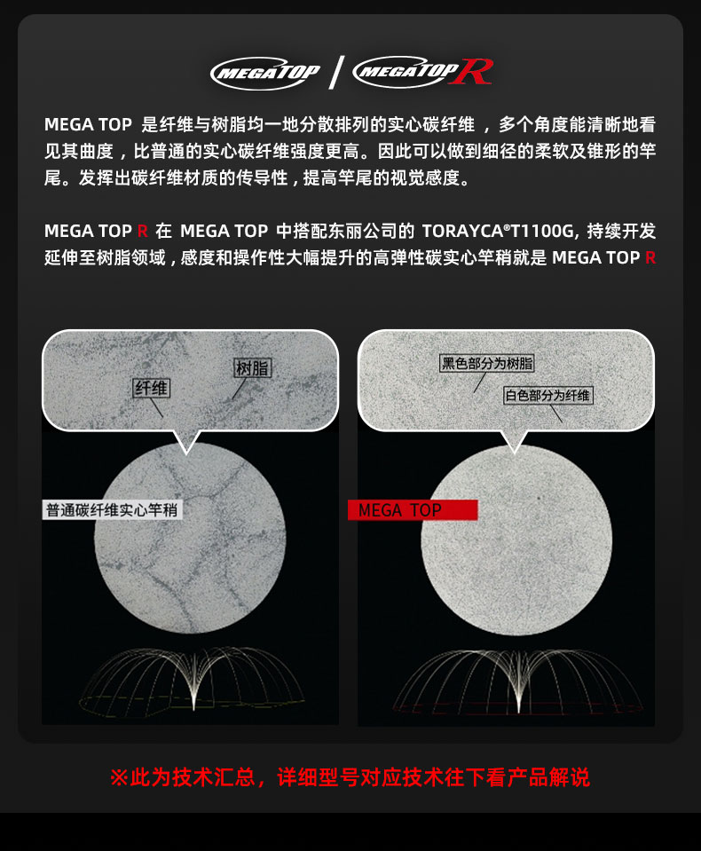 MEGA TOP 是纤维与树脂均一地分散排列的实心碳纤维,无论从哪个方向都能清晰地看见其曲度。比普通的实心碳纤维强度更高。因此可以做到细径的柔软及锥形的竿尾。发挥出碳纤维材质的传导性,大幅提高竿尾的视觉感度。