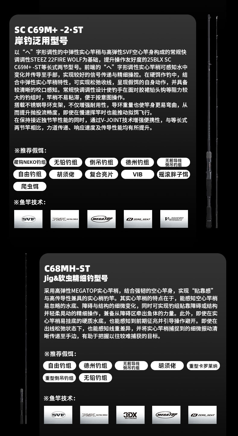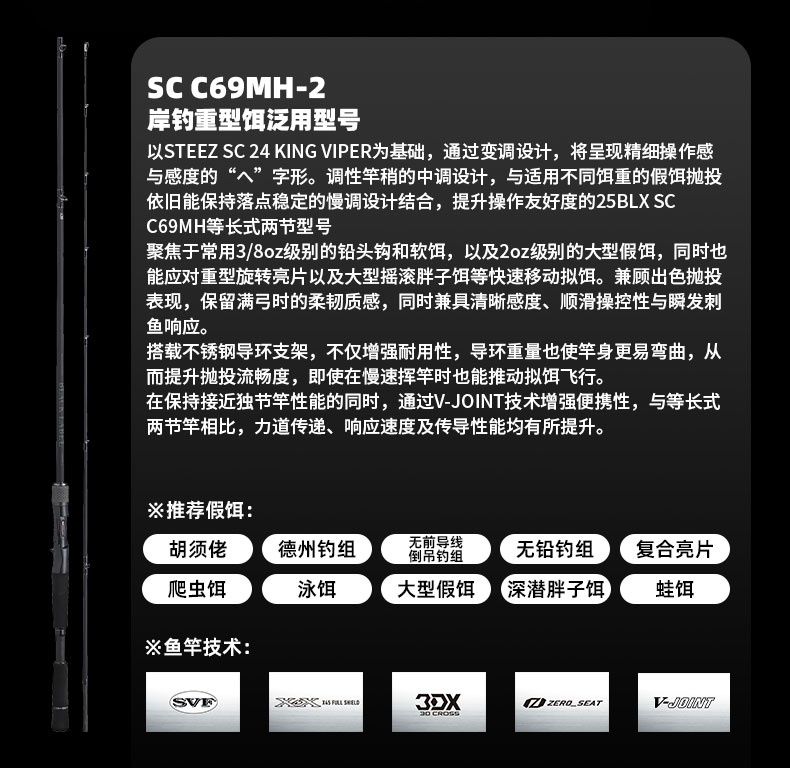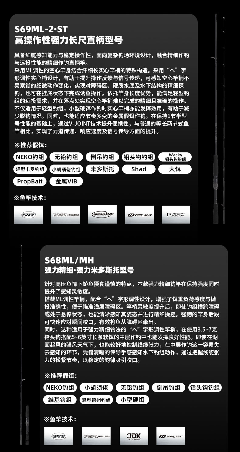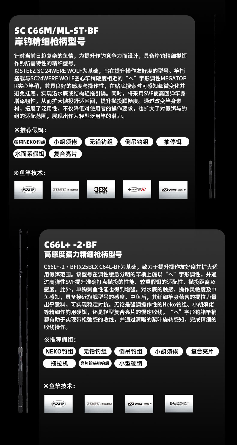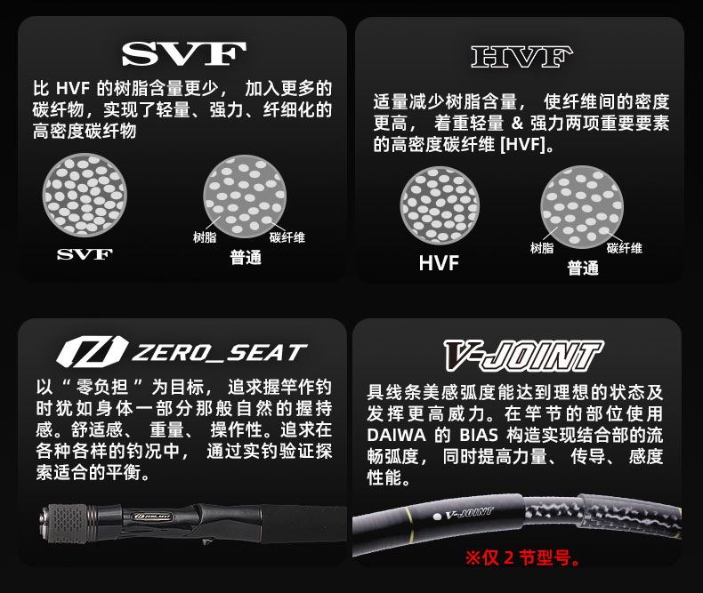 V-JOINT:具线条美感弧度能达到理想的状态及发挥更高威力。在竿节的部位使用DAIWA自身的BIAS构造。实现结合部的理想弧度,同时提高力量/传导/感度性能。 V-JOINTα:使用含nano+的高强度材质及DAIWA自身高精准度钓竿设计制造技术, 使V-JOINT更加强韧、轻盈、美观。