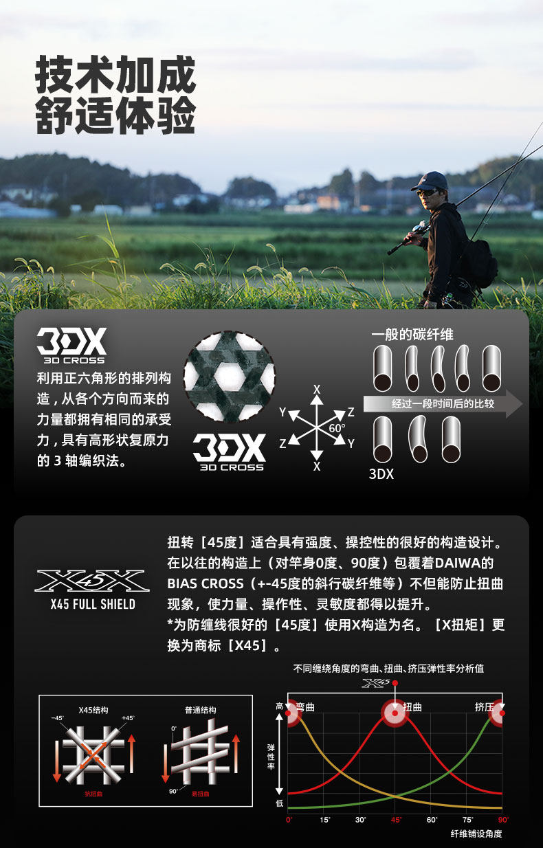 X45:扭转[45°]适合具有强度、操控性的很好的构造设计。在以往的构造上(对竿身0°、90°)包覆着DAIWA的BIAS CROSS(+-45°的斜行碳纤维等)不但能防止扭曲现象,使力量、操作性、灵敏度都得以提升。 X45 FULL SHIELD:针对抛竿、诱鱼、弓鱼、博鱼,X45 FULL SHIELD会排除掉在这些动作和操作中出现的扭曲现象。从容易产生扭曲的素材先端开始,用45°的斜行纤维从能体现效果的外层开始包裹,从而耐扭曲的刚性得到了很大的提升。