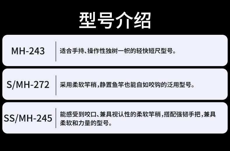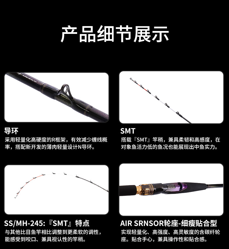 竿尾使用高弹性钛合金的SUPER METAL TOP。高弹性钛合金的SUPER METAL TOP具柔韧且高感度。同时也是视觉(看的感度),连触觉(握的感度),也能判断出鱼讯的新世代竿尾。将柔软且振动传递强的高弹性钛合金和碳纤维及玻璃素材混合,配合在各式各样的钓竿上实现出适合的调子及轻量化。