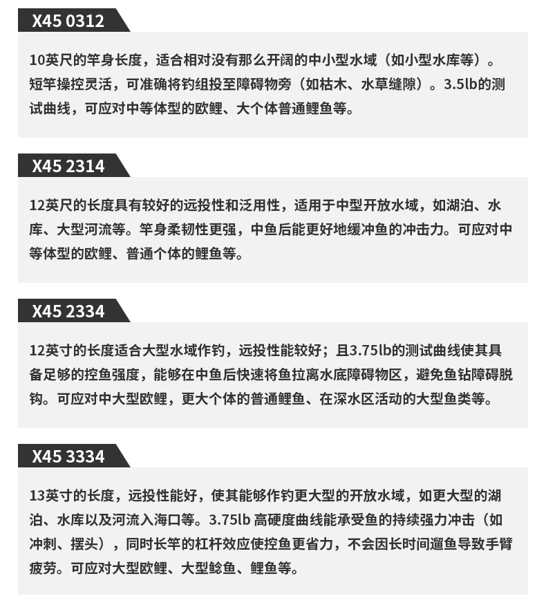X45:扭转[45°]适合具有强度、操控性的很好的构造设计。在以往的构造上(对竿身0°、90°)包覆着DAIWA的BIAS CROSS(+-45°的斜行碳纤维等)不但能防止扭曲现象,使力量、操作性、灵敏度都得以提升。 X45 FULL SHIELD:针对抛竿、诱鱼、弓鱼、博鱼,X45 FULL SHIELD会排除掉在这些动作和操作中出现的扭曲现象。从容易产生扭曲的素材先端开始,用45°的斜行纤维从能体现效果的外层开始包裹,从而耐扭曲的刚性得到了很大的提升。