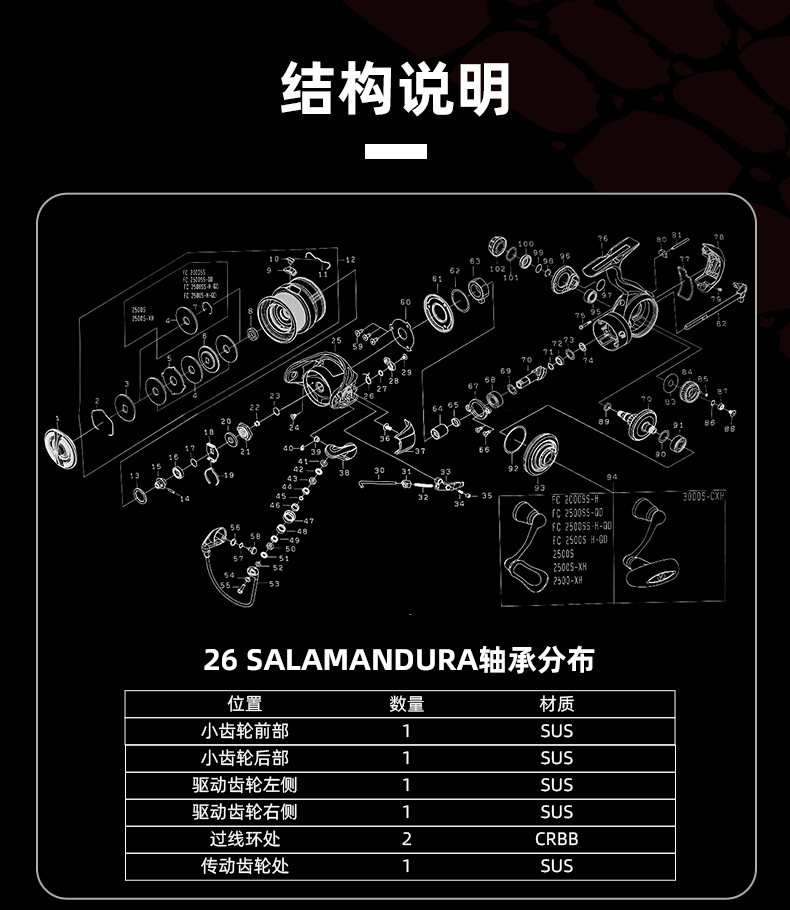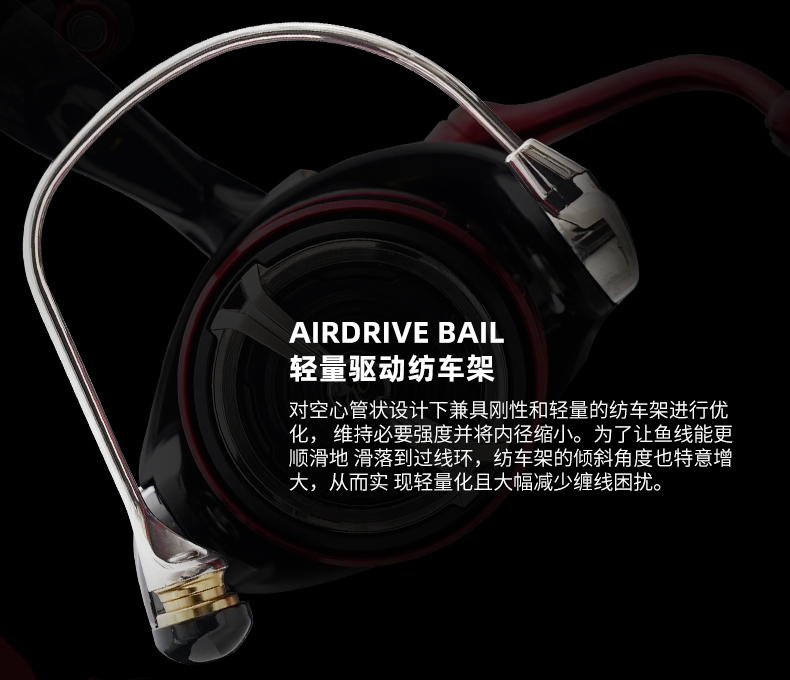 在维持所需强度的同时,缩小内径,以实现纺车架的轻量化。为了能够让钓线更加流畅地移动到导线环,纺车架设定了最佳的倾斜角度。从而进一步实现轻量化,且无炸线。