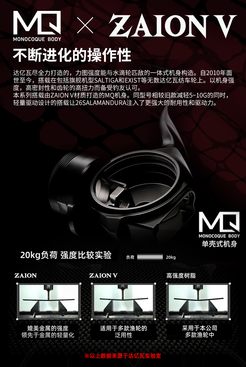 以往的纺车式卷线器大多都是靠机身与机身盖板支撑驱动齿轮的两端,然后以数根螺 丝将之固定。为了追求更高的精密度与刚性,这种单壳式机身取消了机身盖板,直接 将高精密度的垫片以螺丝锁在机身上。如此一来,不仅能够提升齿轮的支持精确度, 也能加强刚性与气密性。除此之外,它也能善用以往卷线器上被螺丝占据的空间,成 功将驱动齿轮的尺寸放大到理想尺寸。单壳机身(MONOCOQUE)的MONO是指单 一,COQUE则是壳的意思。宛若单枚贝壳的构造象征它的强韧,非对称的造形也是 新设计,打破卷线器构造的常识。