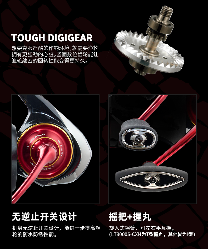 坚固数位齿轮拥有着比锻造齿轮还高的精度。由DAIWA自身的数位设计技术--“数位齿轮II”进化而来,其齿面精度比以往有了大幅提升。在齿轮系统的强度和精度的双重效果下,渔轮能长期保持强有力且如丝般顺滑的收线手感。