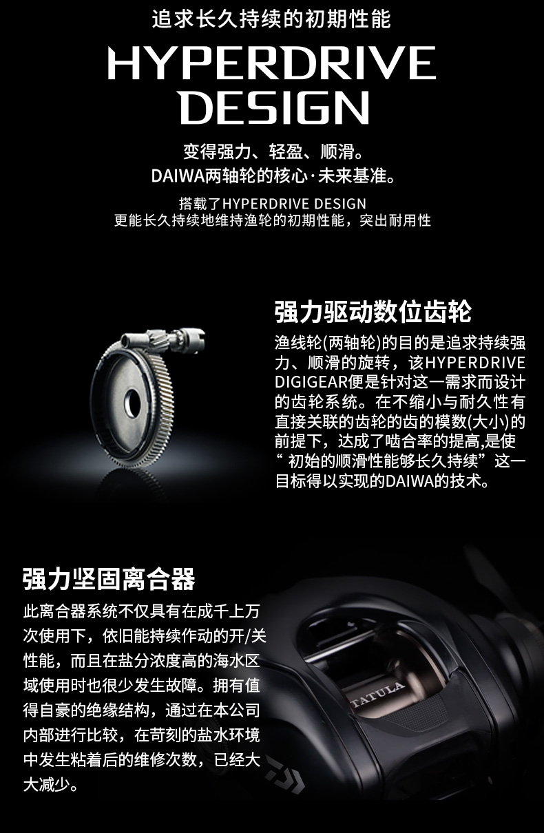 渔线轮(两轴轮)的全新齿轮系统设计,旨在追求持续强力且顺滑的回转。DAIWA独有的技术在不缩小直接影响耐久性的齿轮模数(大小)的前提下,实现啮合率的提高,保障初期的顺滑性能够长久持续。