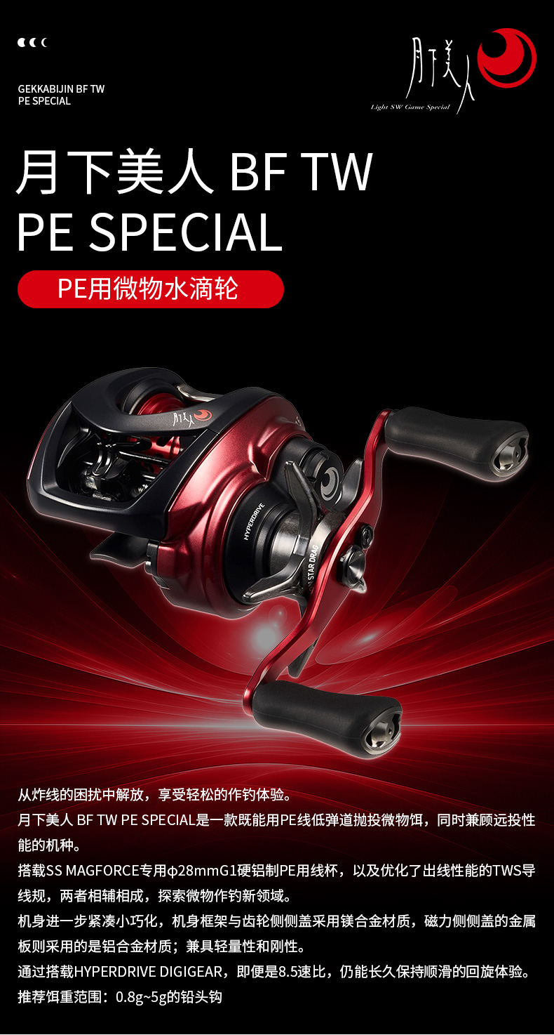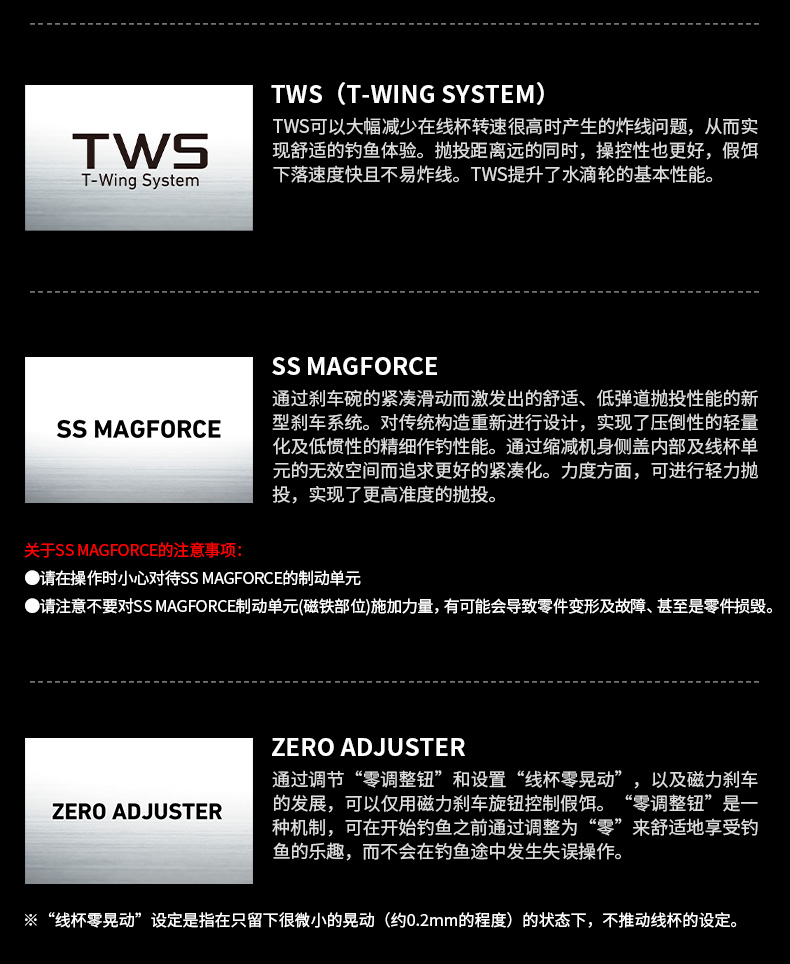 TWS可以大幅减少在线杯转速很高时产生的炸线问题,从而实现舒适的钓鱼体验。抛投距离远的同时,操控性也更好,假饵下落速度快且不易炸线。TWS提升了水滴轮的基本性能。