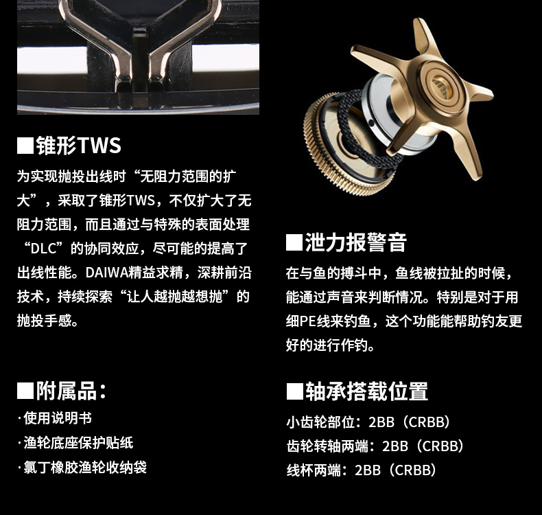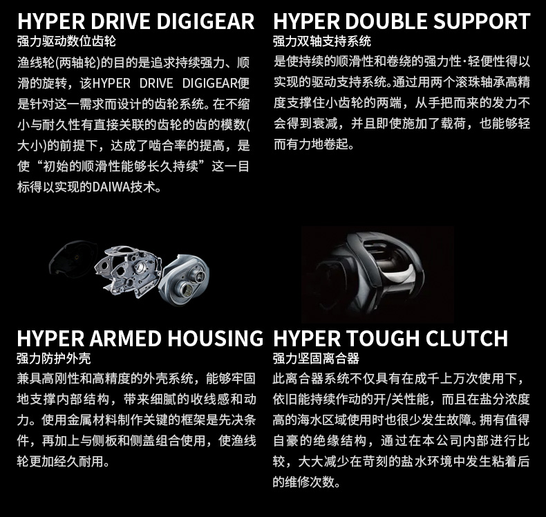 渔线轮(两轴轮)的全新齿轮系统设计,旨在追求持续强力且顺滑的回转。DAIWA独有的技术在不缩小直接影响耐久性的齿轮模数(大小)的前提下,实现啮合率的提高,保障初期的顺滑性能够长久持续。