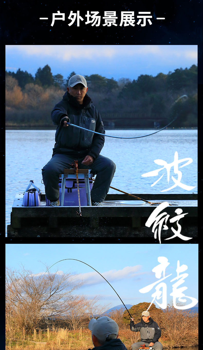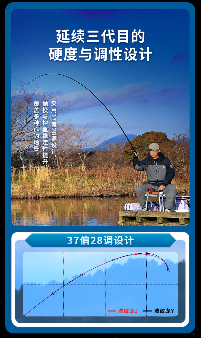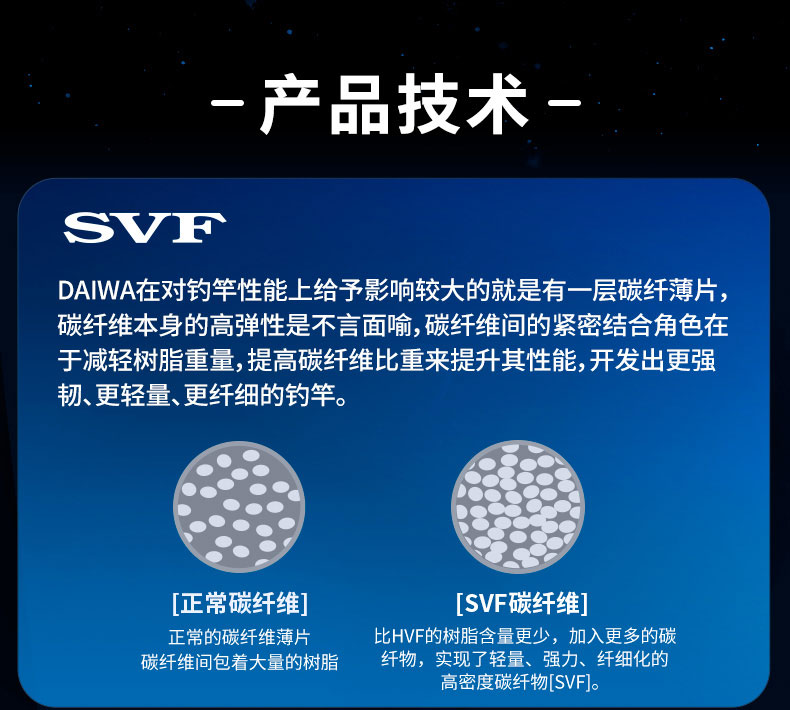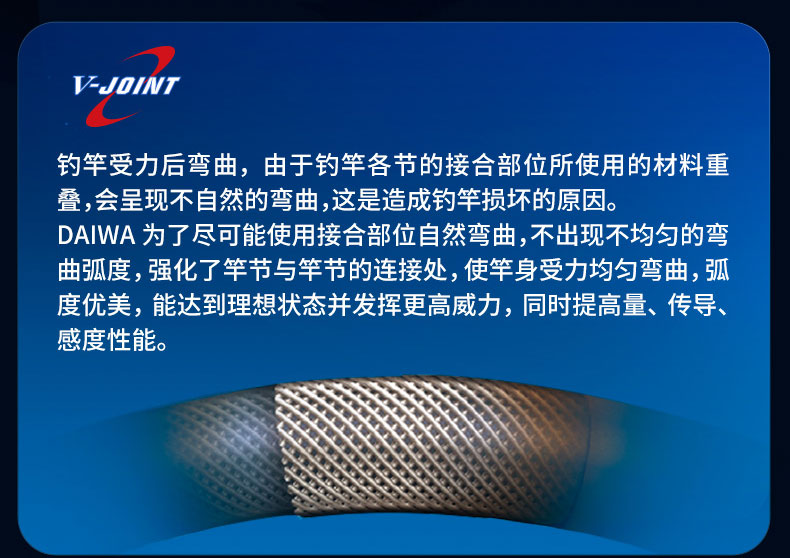 V-JOINT:具线条美感弧度能达到理想的状态及发挥更高威力。在竿节的部位使用DAIWA自身的BIAS构造。实现结合部的理想弧度,同时提高力量/传导/感度性能。 V-JOINTα:使用含nano+的高强度材质及DAIWA自身高精准度钓竿设计制造技术, 使V-JOINT更加强韧、轻盈、美观。