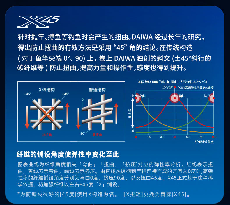 X45:扭转[45°]适合具有强度、操控性的很好的构造设计。在以往的构造上(对竿身0°、90°)包覆着DAIWA的BIAS CROSS(+-45°的斜行碳纤维等)不但能防止扭曲现象,使力量、操作性、灵敏度都得以提升。 X45 FULL SHIELD:针对抛竿、诱鱼、弓鱼、博鱼,X45 FULL SHIELD会排除掉在这些动作和操作中出现的扭曲现象。从容易产生扭曲的素材先端开始,用45°的斜行纤维从能体现效果的外层开始包裹,从而耐扭曲的刚性得到了很大的提升。