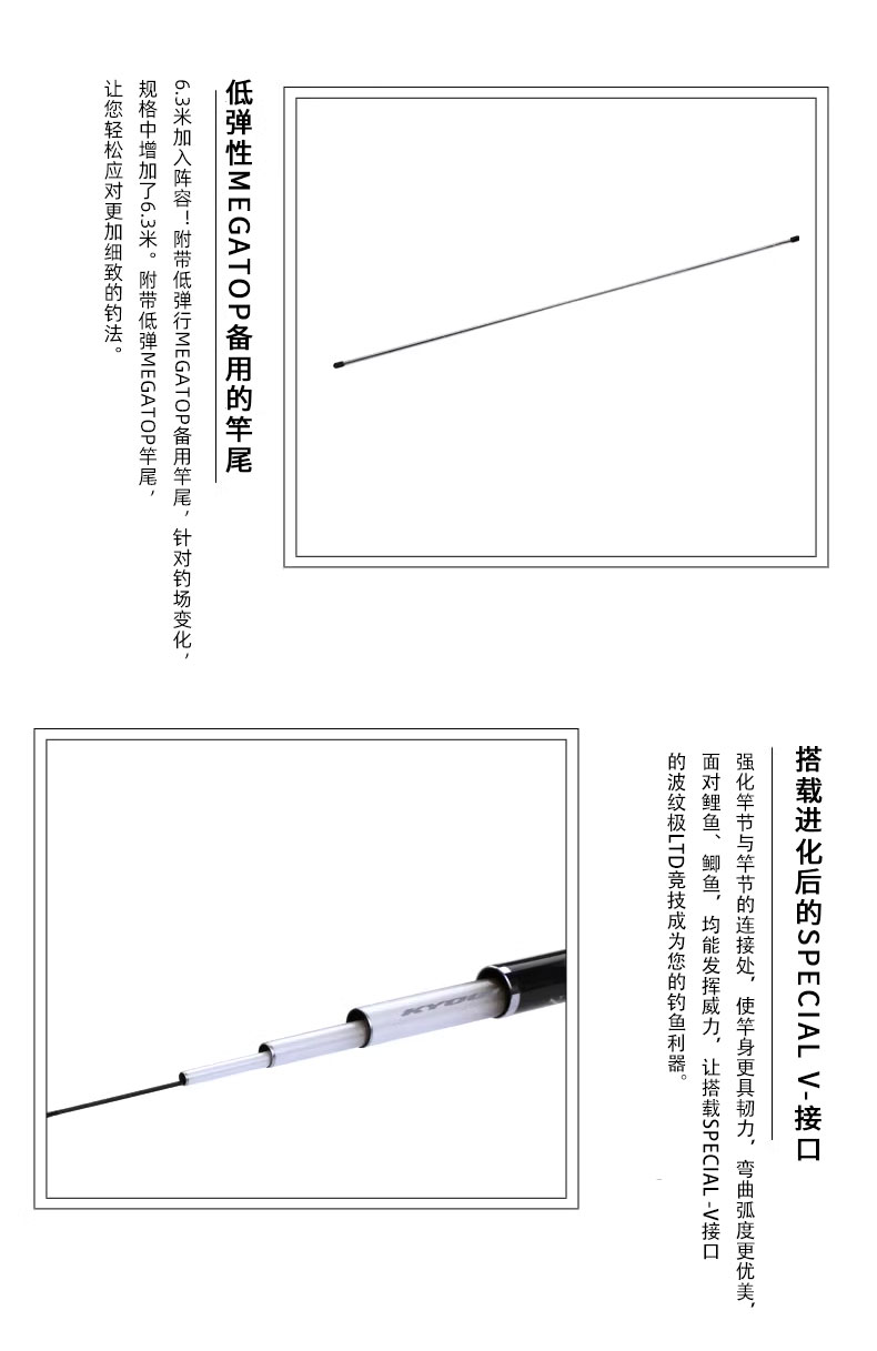 MEGA TOP 是纤维与树脂均一地分散排列的实心碳纤维,无论从哪个方向都能清晰地看见其曲度。比普通的实心碳纤维强度更高。因此可以做到细径的柔软及锥形的竿尾。发挥出碳纤维材质的传导性,大幅提高竿尾的视觉感度。